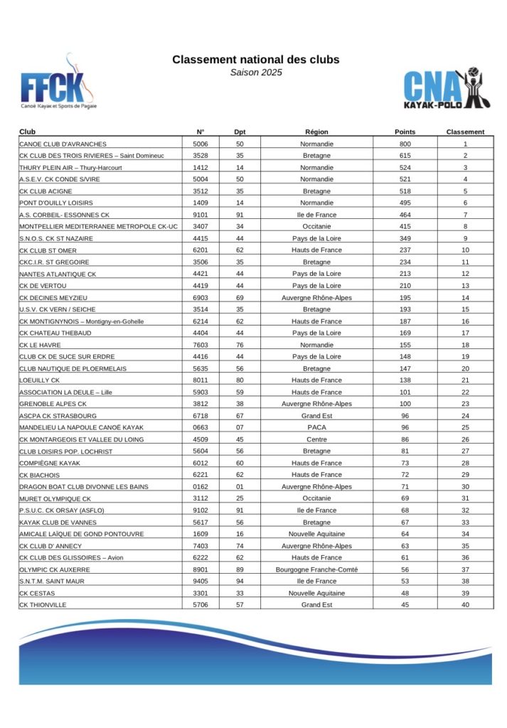 Pour la 4e année consécutive, le Canoë-Club d’Avranches est reconnu meilleur club français pratiquant le kayak-polo ! Comme tous les ans, en début d’année, la Fédération française de canoë kayak et sports de pagaie a annoncé le classement des clubs 2025. Et c’est avec une grande fierté que nous vous annonçons que nous remportons le classement pour la 4ème saison consécutive devant le Canoë-Kayak Club des 3 Rivières (Saint-Domineuc) qui conserve la deuxième marche du podium, et le club de Thury Plein Air qui reprend la 3ème place.